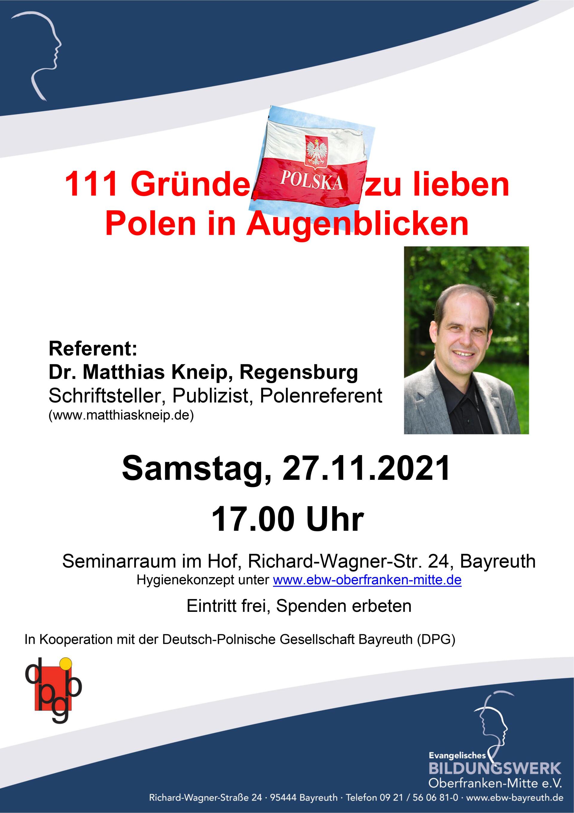 Am 27.11.21 um 17.00 stellt der Schriftsteller Matthias Kneip zwei seine Bücher "111 Gründe , Polen zu lieben" und "Polen in Augenblicken" in EBW Seminarraum im Hof vor.