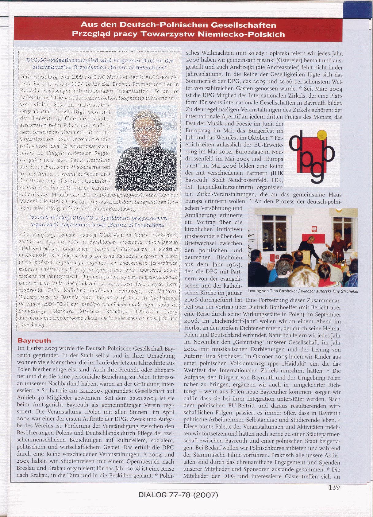An den Prozess der deutsch-polnischen Versöhnung und Annäherung erinnerte ein Vortrag über die kirchlichen Initiativen (insbesondere über den berühmten Briefwechsel zwischen den polnischen und deutschen Bischöfen aus dem Jahr 1965), den die DPG mit Partnern von der evangelischen und der katholischen Kirche im Januar 2006 durchgeführt hat. Eine Fortsetzung dieser Zusammenarbeit war ein Vortrag über Dietrich Bonhoeffer (mit Bericht über eine Reise durch seine Wirkungsstätten in Polen) im September 2006.